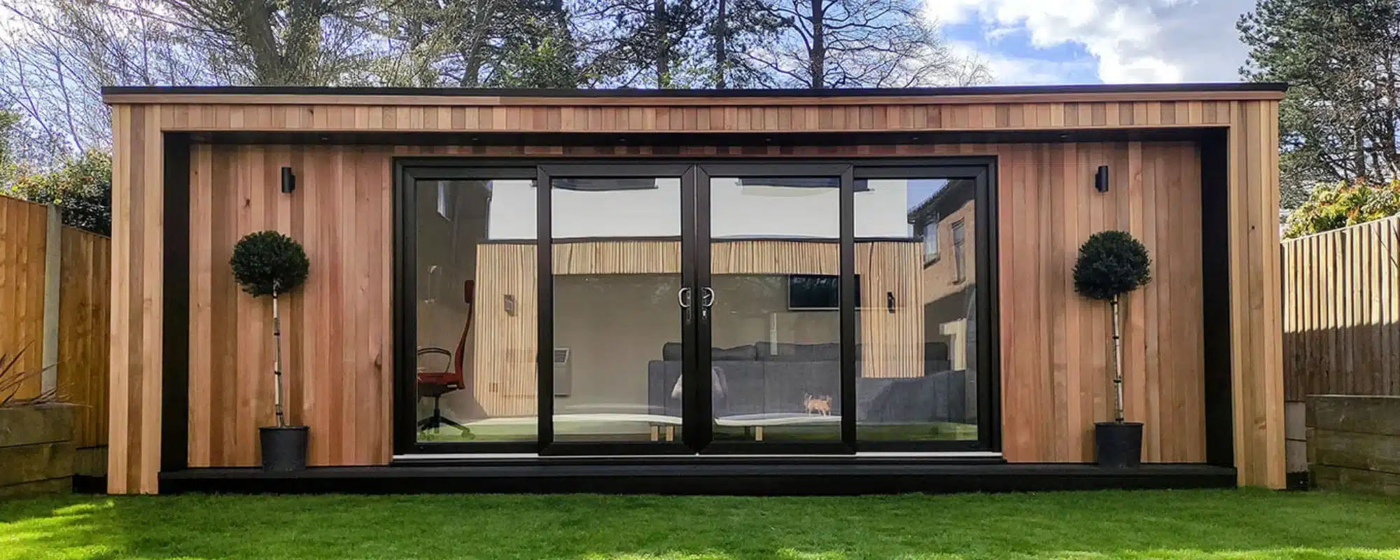 Doors and fixed panels form a glass facade across the front of our Littondale garden office room.