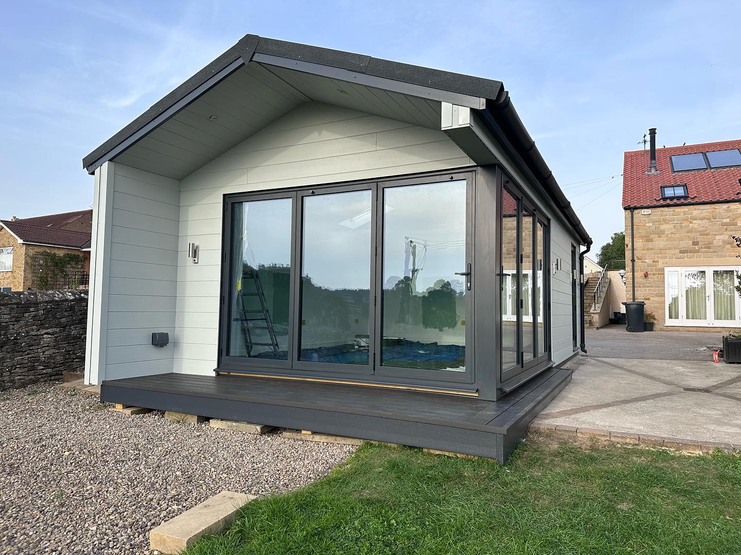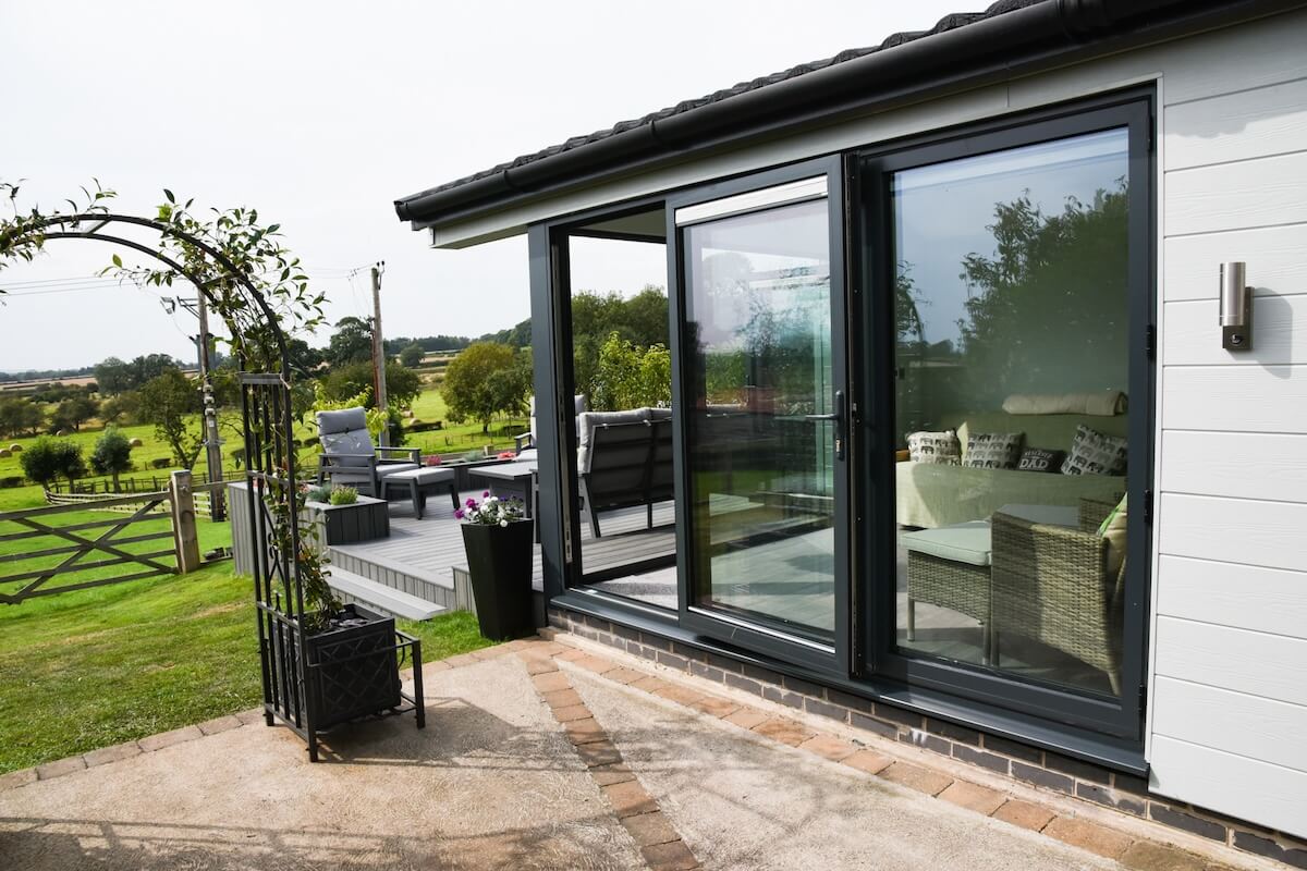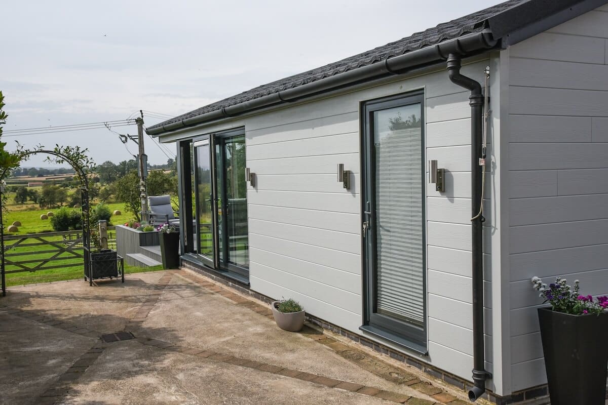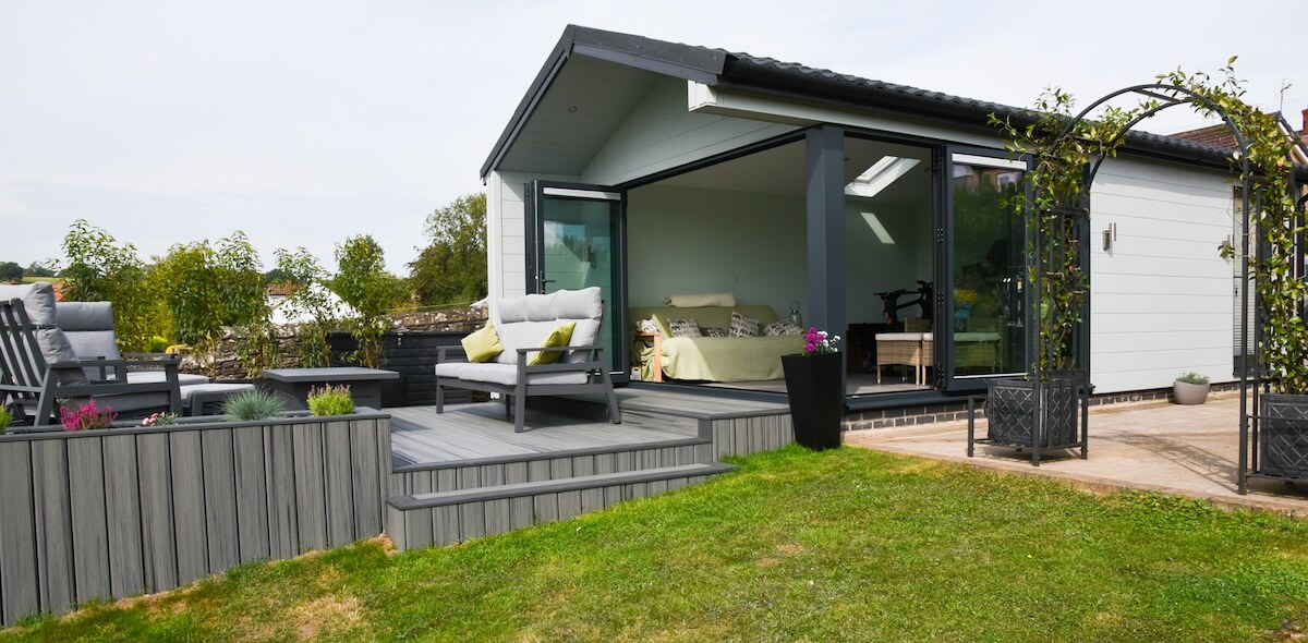 From our curated collection of garden room designs, the Ingleborough Lodge was selected for its impressive 5 metre bi-fold door frontage and impressive combination of living, kitchen, bedroom and en-suite areas. The client was looking for a lodge-style space that combines elegance, versatility and strong connections to the outdoors, and we tailored the specification accordingly.