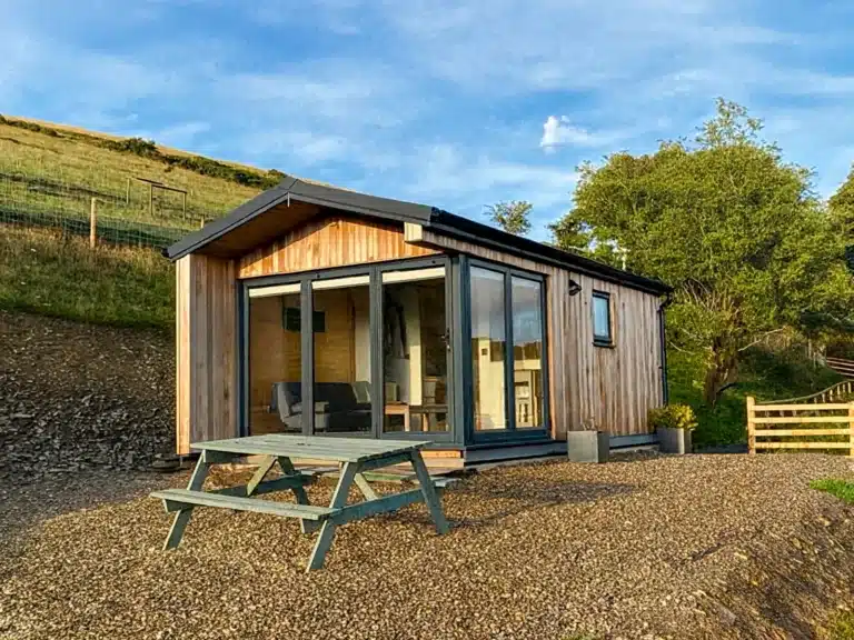 Aluminium bi-folding doors create an impressive 5m opening, allowing the lodge to open out onto the views.